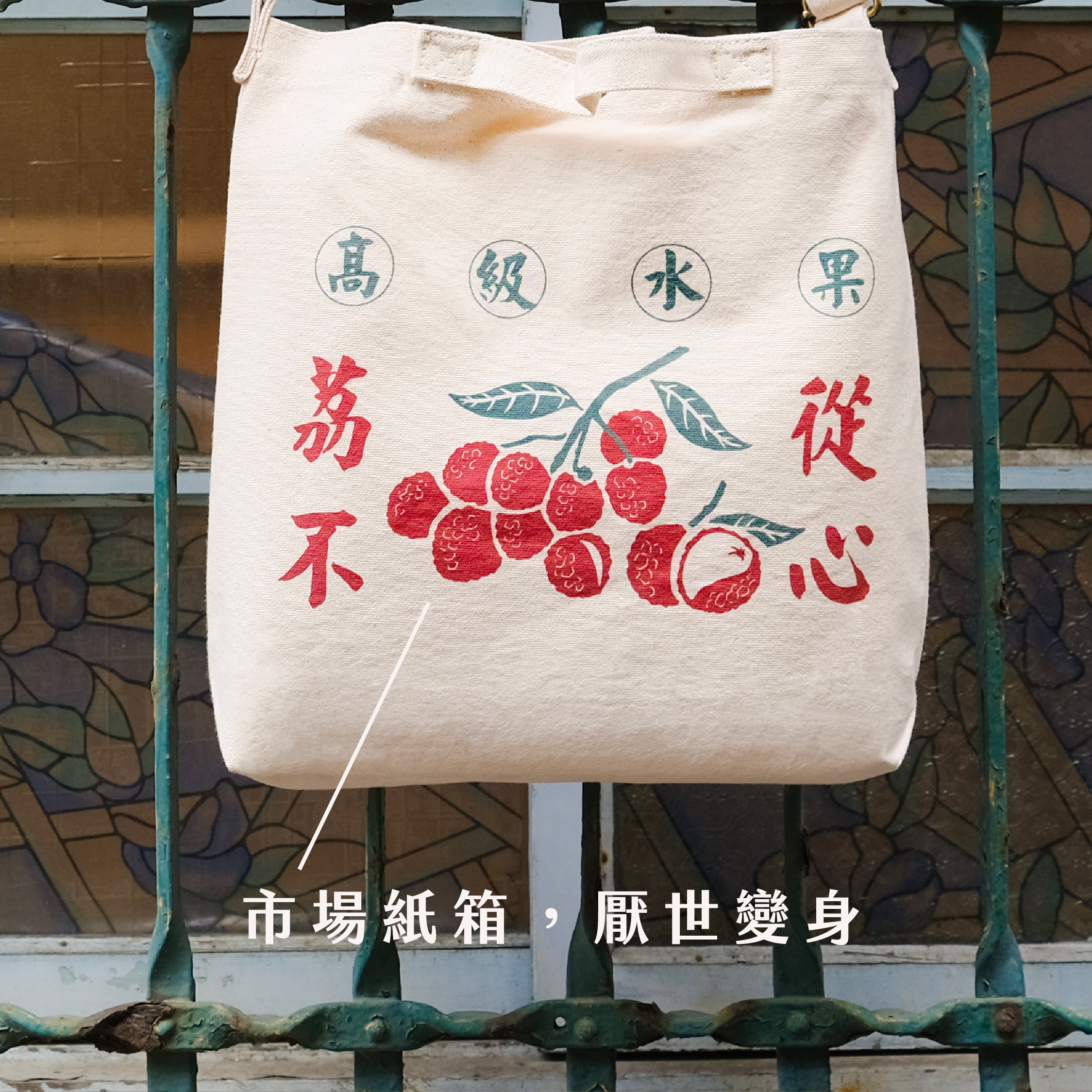 你今天「荔不從心」了嗎?傳統市場獨特的水果紙箱彩繪圖樣,讓厚實好用的帆布袋更具存在感。內心的厭世宣言,不怕被人看見。