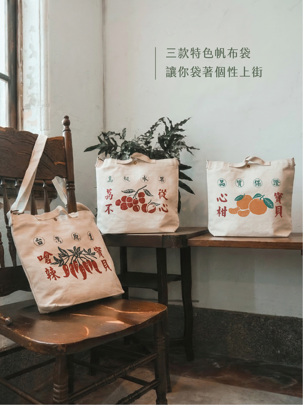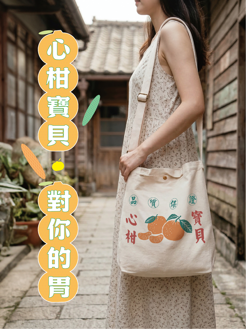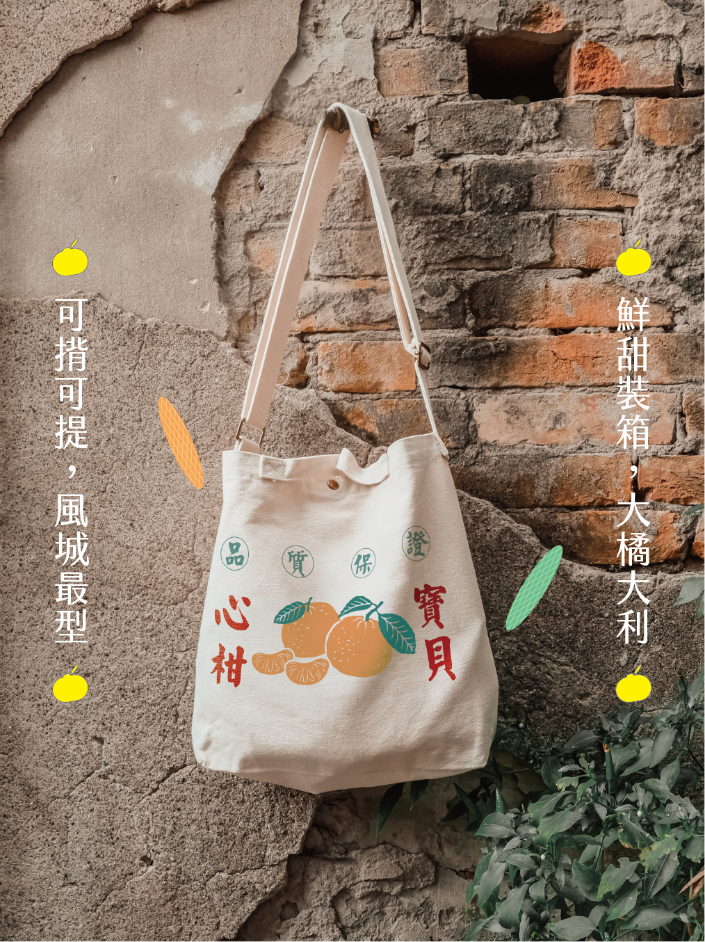 新竹縣大山背地區共種植了36種以上的柑橘類作物,以經典的柑橘紙箱圖案為基礎,讓這款實用好揹的包包更具在地活力。揹上包包大方展現,你就是眾人的「心柑寶貝」!