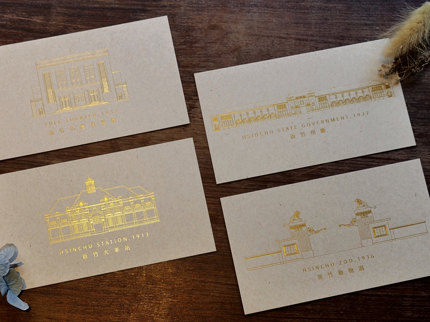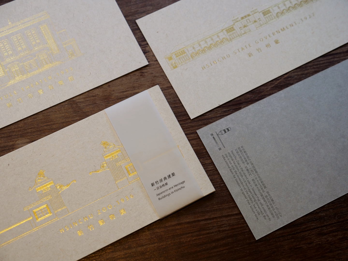 讓四棟新竹日治經典建築成為可蒐藏的紙上線條,以細緻的燙金,呈現-新竹火車站、新竹州廳、有樂館及動物園。每張明信片的背面附有中英文簡介,左上角更加入趣味圖標「風向袋」,讓你能記錄下當時的新竹風!