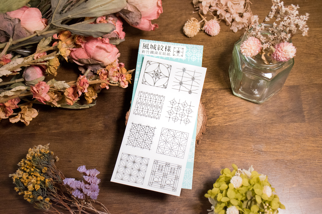 新竹鐵窗花貼紙,精選八款新竹各處的窗花紋樣,以純燙銀透明貼的規格,盡可能呈現紋樣本身的美感。